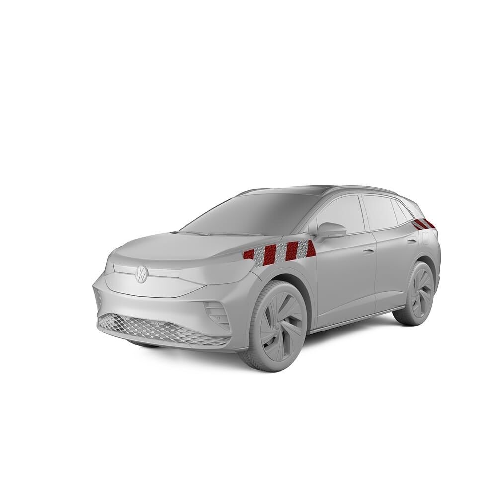 Die passgenauen Warnmarkierungszuschnitte für den VW ID.4 ab Baujahr 2020 sind als Set für die vollständige Markierung ihres Fahrzeugs erhältlich oder als einzelne Komponenten für Heck, Front oder die Seiten.